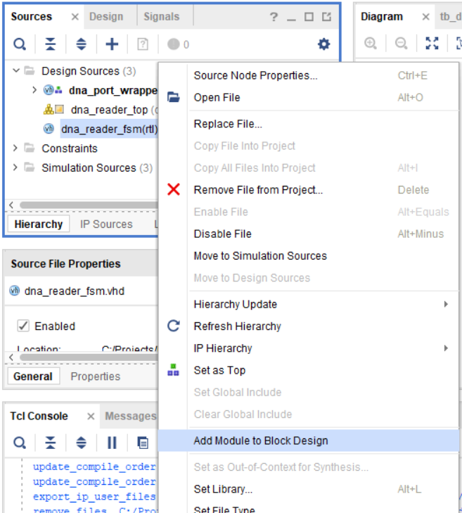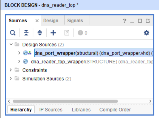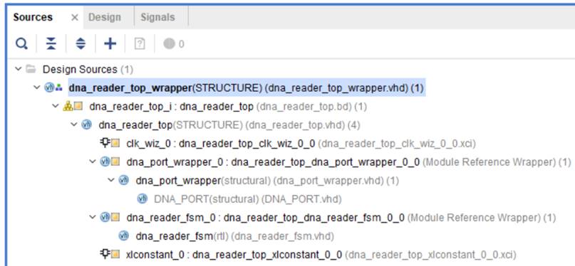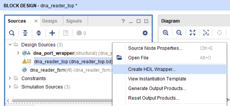 Обратите внимание, что модули RTL пока что не появляются в иерархии Block Design. Необходимо создать обёртку для Block Design «dna_reader_top», кликнув по нему правой кнопкой мыши и выбрав Create HDL Wrapper:
