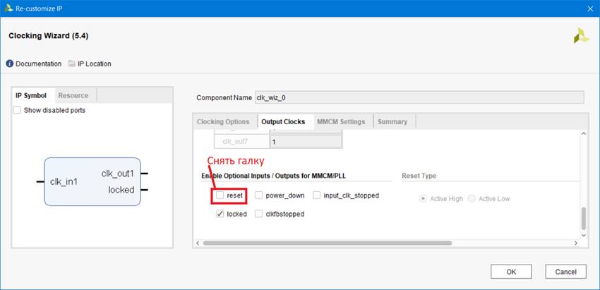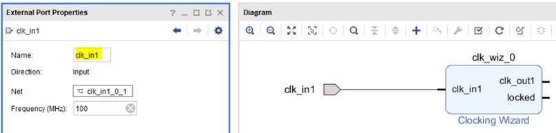 Выполним подключение внешних выводов и соединение блоков. Сделаем вход clk_in1 модуля clk_wiz_0 внешним: