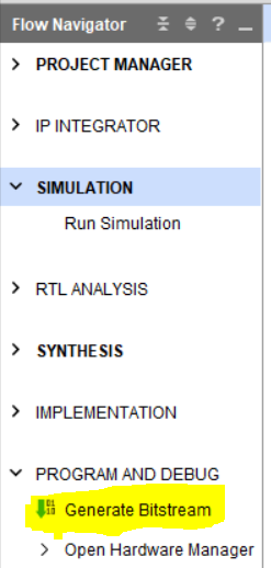 Теперь мы можем запустить имплементацию проекта и генерацию файла прошивки (bitstream). Нажимаем Generate Bitstream и ждём окончания выполнения операции.