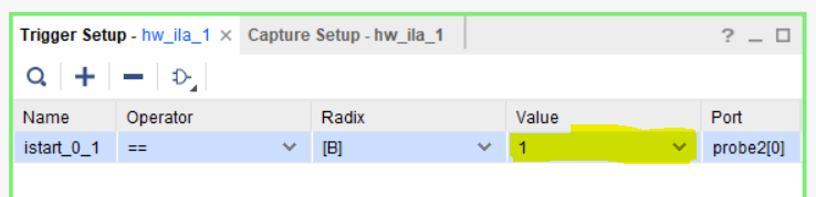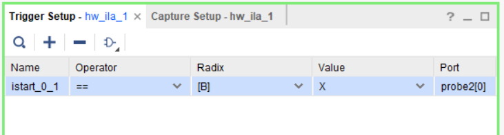 Теперь необходимо настроить условие для этого триггера. Сейчас поле Value имеет значение «х». Это означает, что запись состояний наблюдаемых цепей будет начинаться вне зависимости от состояния сигнала istart. Измените значение поля Value сигнала istart на «1».