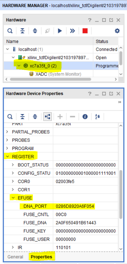На самом деле все уже было прочитано Vivado в тот момент, когда мы выполняли поиск устройств по нажатию кнопки Autoconnect. Значение DNA может быть найдено следующим образом (см. рисунок):