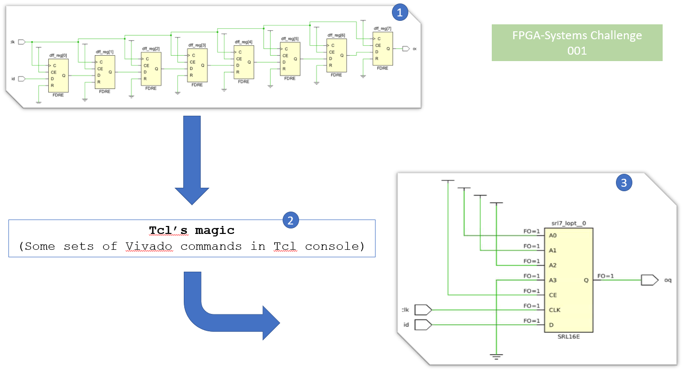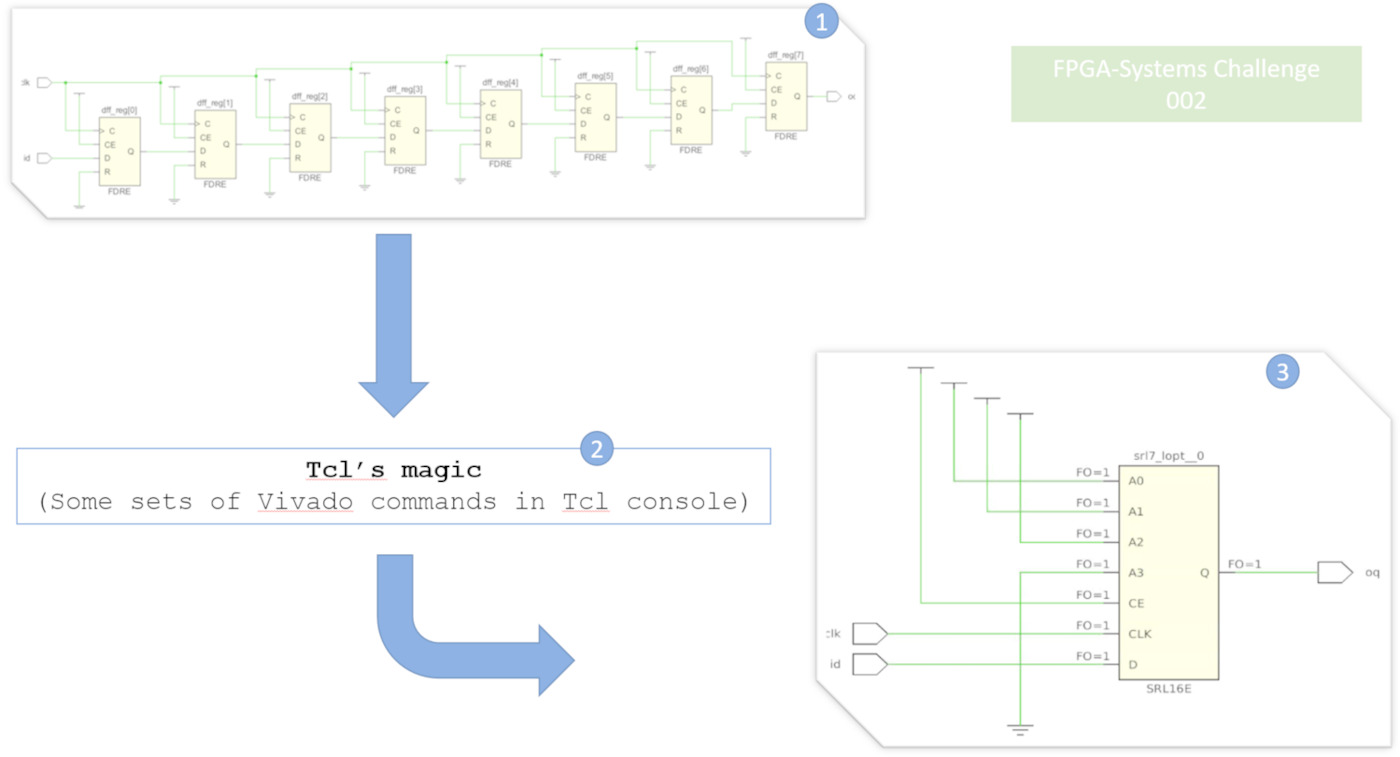 - Используя только Tcl команды Vivado необходимо преобразовать цепочку из 8-ми триггеров в один аппаратный сдвиговый регистр.