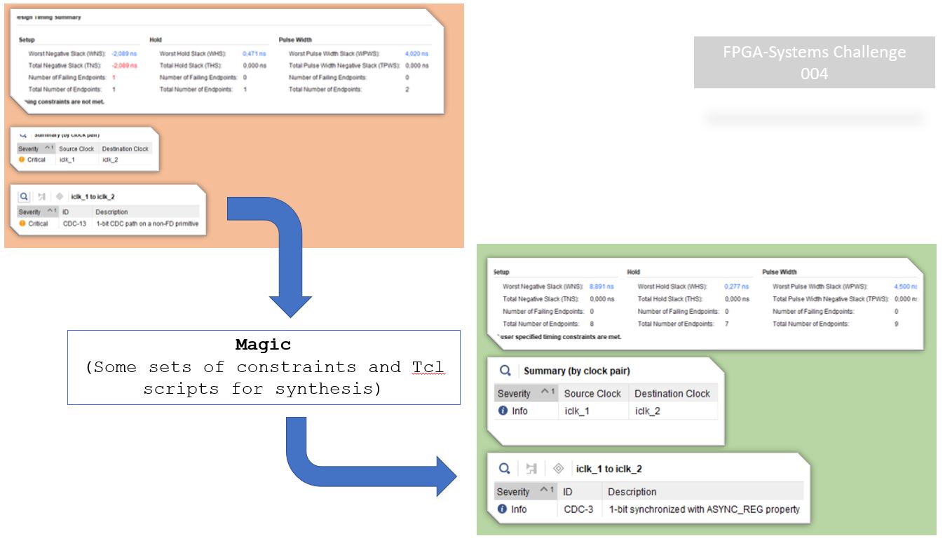 - свести тайминг для схемы, содержащей два тактовых домена (CDC - Clock Domain Crossing) - setup slack на post-synthesis должен быть неотрицательным