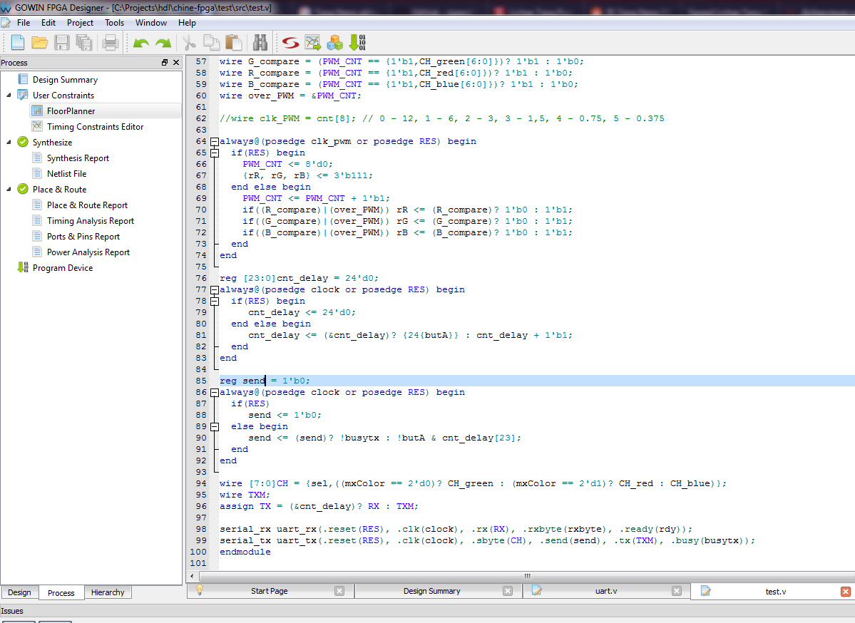 Дабы далеко не отходить от RGB-светодиода решено было сделать управляемый по UART трехканальный ШИМ с таким расчетом, чтобы и удобно и при этом хватало возможностей терминала. Предположим, что скважность канала цвета можно менять значением принятого в терминал символа. Предположим, также, что есть символ, который является “табуированным” (=) и приводит к переходу из режима изменения скважности канала в режим выбора канала цвета. Выбор канала осуществляется вводом в терминал одного из символов r, g, b. Получается простенький автомат из двух состояний плюс приемник и передатчик UART. Учитывая входную частоту 24МГц, чтобы не мучиться с большими цепями деления, установим скорость передачи/приема по UART в 115200 бод. По нажатию на кнопку “А” в UART выдается значение текущего канала. На дополнительные пины выдается сигнал текущего канала и состояние триггера выбранного режима. Трехканальный ШИМ, опять же, чтобы не мучиться, со сменой скважности в любой момент счета. Модуль UART был разработан ранее специально для очень маленьких ПЛИС (конкретно для Xilinx xc9572), в которые кроме UART нужно впихивать и многое другое.И вот тут то… сразу не задалось, первая же попытка “пощупать” за UART, организовав простейший байпас с RX на TX, провалилась, хотя казалось чего бы уж проще? Поплутав некоторое время в назначении системных ног ПЛИС (RECONFIG_N и DONE) для каналов UART и поняв с помощью подсказок от АО “Восток”, что искать надо не там где светло, а там где темно и лениво, вооружился осциллографом и выяснил, что часть микросхемы CH552T, ответственная за UART, на поверку “сопела в тряпочку” подняв ноги RX/TX к питанию. Вообще данная микросхема вела себя крайне подозрительно! Выяснилось, что детектировать ПЛИС по JTAG, находящийся в этом же мосте, она желает не на всех скоростях (только 2МГц) и ни при каждом запросе из программатора. При этом если воспользоваться настройками среды для прошивки, попадающими в программатор автоматически при его вызове, ПЛИС прошивалась всегда и на любой из имеющихся скоростей. Отнеся эти особенности к национальным, я решил больше уже не мучить CH552T, который, кстати сказать, в системе определился без драйверов в виду его родства толи с CH340G толи с FTDI, чьи драйвера в системе уже имелись. Как бы не было горько, от осознания несамодостаточности Tang Nano, пришлось прицепить к плате внешний USB-UART и продолжить эксперимент.