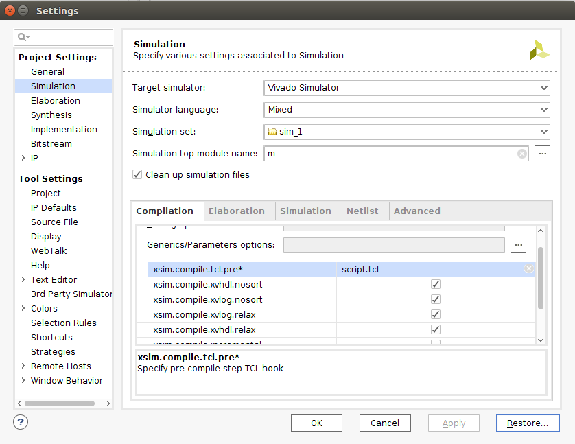 Открывает настройки проекта (Tools -> Settings -> Simulation->Compilation) и в настройках симуляции есть поле xsim.compile.tcl.pre в него добавляем ссылку на script.tcl – таким образом без лишних манипуляций со стороны разработчика .so библиотека будет подлинковываться при нажатии на кнопку симуляции.
