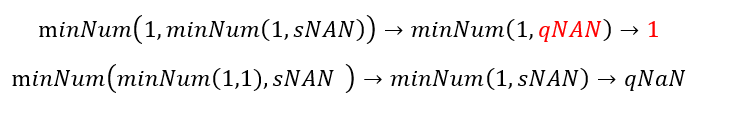 На практике многие разработчики микропроцессоров по своему воспринимают и обрабатывают qNaN/sNaN и отходят от определений стандарта. Как видно из функции ниже, в зависимости от порядка скобок операция minNum в одном случае возвращает 1, а в другом qNaN [в 2019-м стандарте IEEE-754 данная операция была заменена аналогичной, математически корректной функцией].