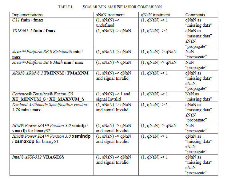 Ниже приведена сравнительная таблица, где рассматривается скандальная операция fmin [IEEE-754-2008] и как она имплементирована в различных компиляторах, процессорах.