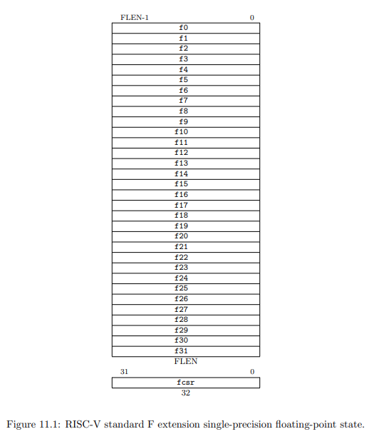 Обратимся к стандарту RISC-V - нас интересует документ с таким названием "Volume 1, Unprivileged Spec v". В 11 главе начинается обзор расширения F [float].