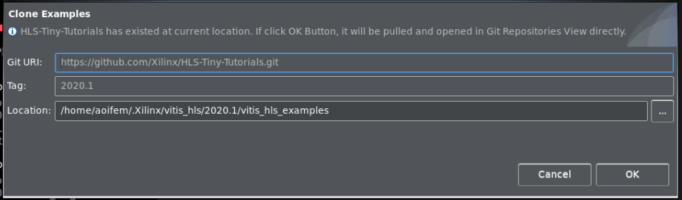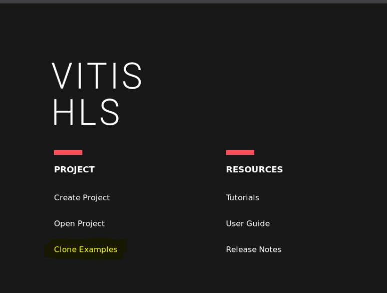 1. Открыть Vitis HLS GUI. Из появившегося окна, выбрать ‘Clone Examples’ что бы скопировать проект с примером для Vitis HLS из GitHub: