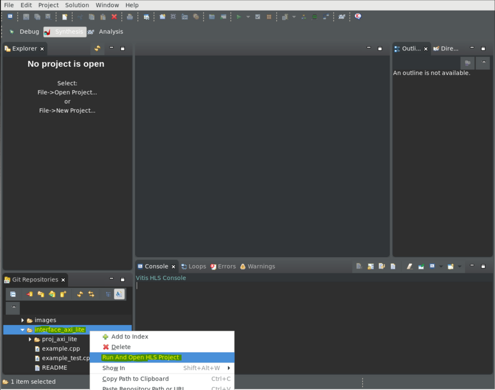 4. Прокрутить до момента, когда вы найдете пример interface_axi_lite. Кликнуть правой кнопкой на имени папки и выбрать опцию ‘Run and Open HLS Project’.
