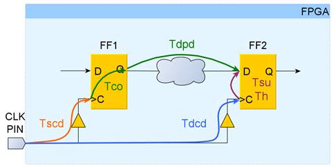 •  (Source Clock Delay) – задержка тактового сигнала от источника, в нашем примере ножка FPGA clk_pin, до тактового входа триггера FF1;