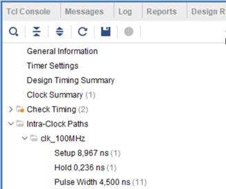 Увидеть пути, для которых проведен временной анализ, можно, если после размещения и трассировки открыть отчет Timing Summary на вкладке Intra-Clock Path / clk_100MHz (рисунок 4).