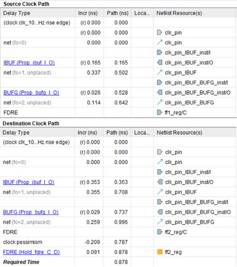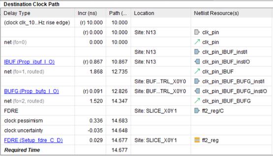 Далее после строки с надписью FDRE показаны еще три задержки, которые представляют из себя время установки Tsu для триггера FF2 (0.029 нс), а также пессимизм Tcp (Clock Pessimism, 0.336 нс.) и неопределенность Tcu (Clock Uncertainty, -0.035 нс.) тактового сигнала. О последних двух задержках будет рассказано далее в статье в пунктах 7 и 8.