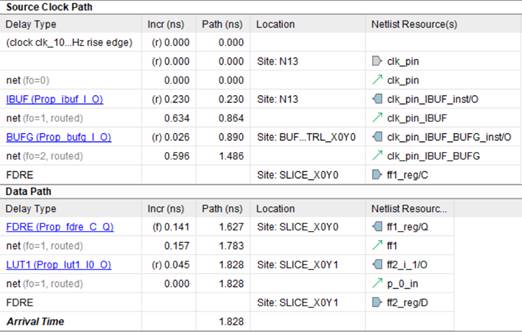 В разделе, представленном на рисунке 7, указаны задержки при распространении данных, которые состоят из задержки clock to output (Tco) для триггера FF1, задержки распространения через nets и LUT (Tilo). Просуммировав значения в столбце Incr, получим 1.002 нс, что совпадает со значением Data Path Delay на рисунке 5.