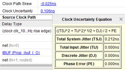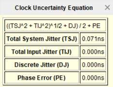 Слагаемое Tcu (Clock Uncertainty), которое встречалось при рассмотрении анализа по Setup, учитывает неопределенность тактового сигнала из-за джиттера. Нажав на значение Clock Uncertainty(рисунок 5), можно увидеть способ вычисления неопределенности (рисунке 13).