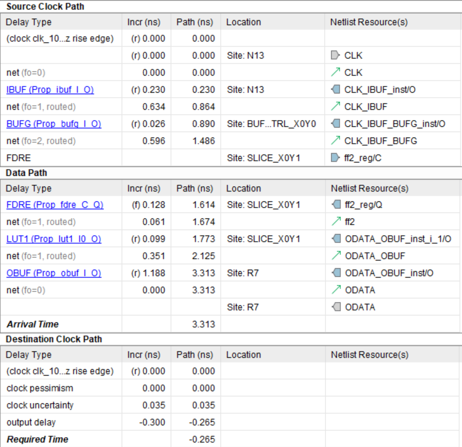 Значение задержки output delay вычисляется по формуле (4) и равно 0.2 - 0.4 + 0.5 - 0 = 0.3 нс. Учитывая неопределенность тактового сигнала получаем, что данные должны появится на ножке ODATA в момент времени -0.265 нс. Отрицательное значение Required Time означает, что данные должны появится на выходе ODATA FPGA раньше, чем генератор сформирует защелкивающий фронт.