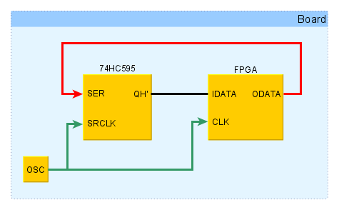 В качестве примера будем рассматривать устройство, схема которого показана на рисунке 1. Помимо FPGA на плате присутствует микросхема 74HC595 [3], которая представляет из себя обычный регистр сдвига и часто поставляется в составе обучающих наборов для Arduino. Также на плате располагается генератор (OSC), формирующий тактовый сигнал для FPGA и 74HC595.