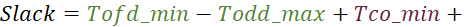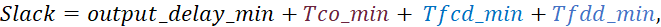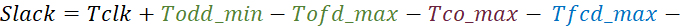 Если Slack принимает отрицательное значение, то это указывает, что данные приходят на вход защелкивающего триггера позже, чем требуется. То есть, ограничение по Setup нарушено. Используя полученные ранее уравнения, можно записать полное выражение для расчета Slack: