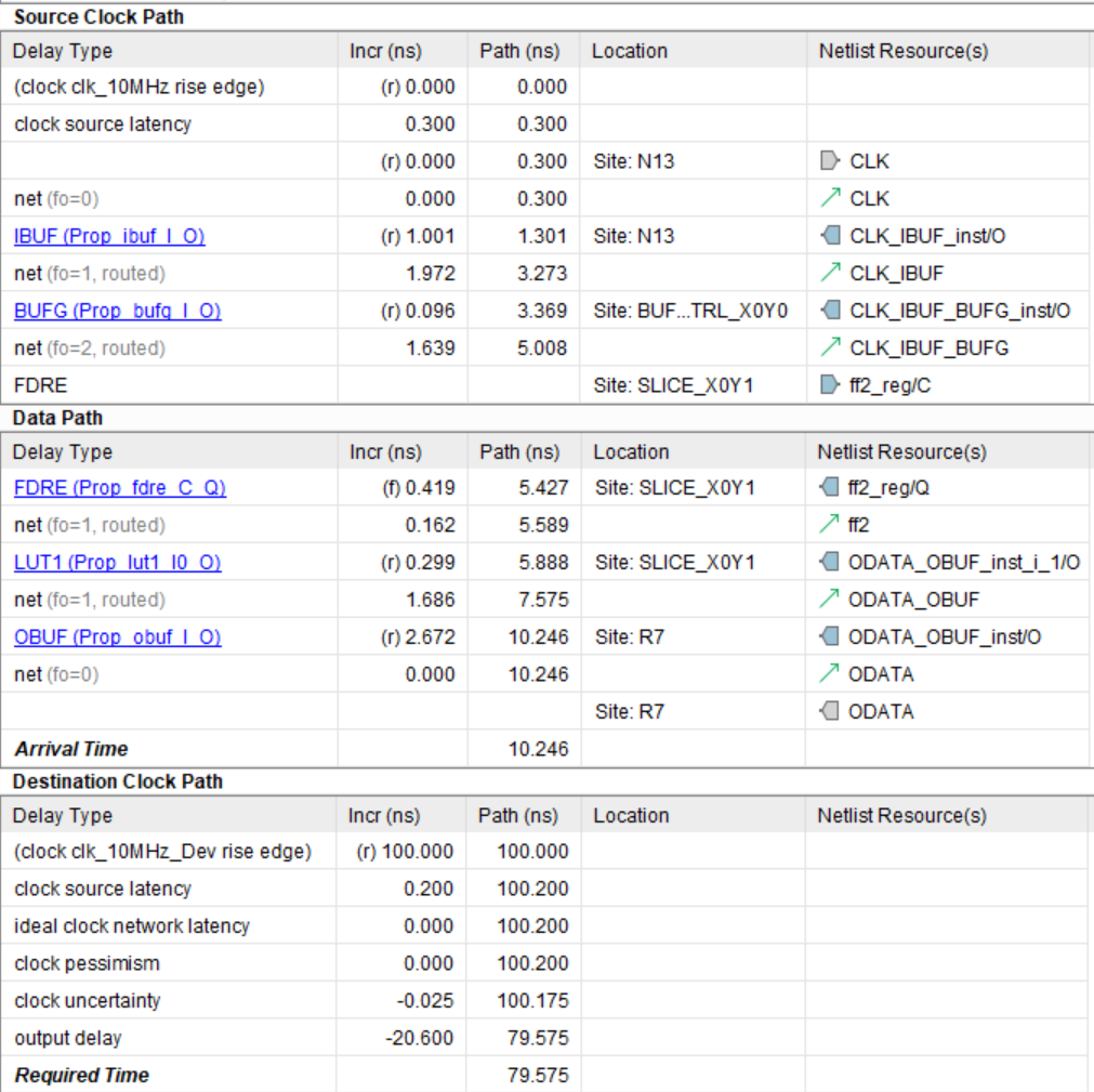 В заключении отметим следующий интересный момент. Можно увидеть, что значения Slack, представленные на рисунках 4 и 7, отличаются и равны 69.319 нс и 69.329 нс соответственно. Разница в 0.01 нс возникает из-за разной величины неопределенности тактового сигнала. Более подробно о причине такого несоответствия можно прочитать в [1].