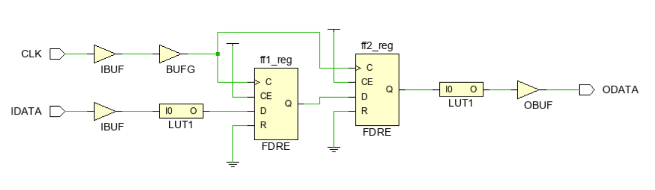 Также пусть в FPGA загружен простой проект, состоящий из двух триггеров и двух LUT, которые реализуют логическое отрицание. Схема проекта показана на рисунке 2.