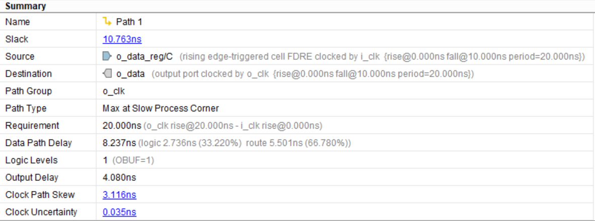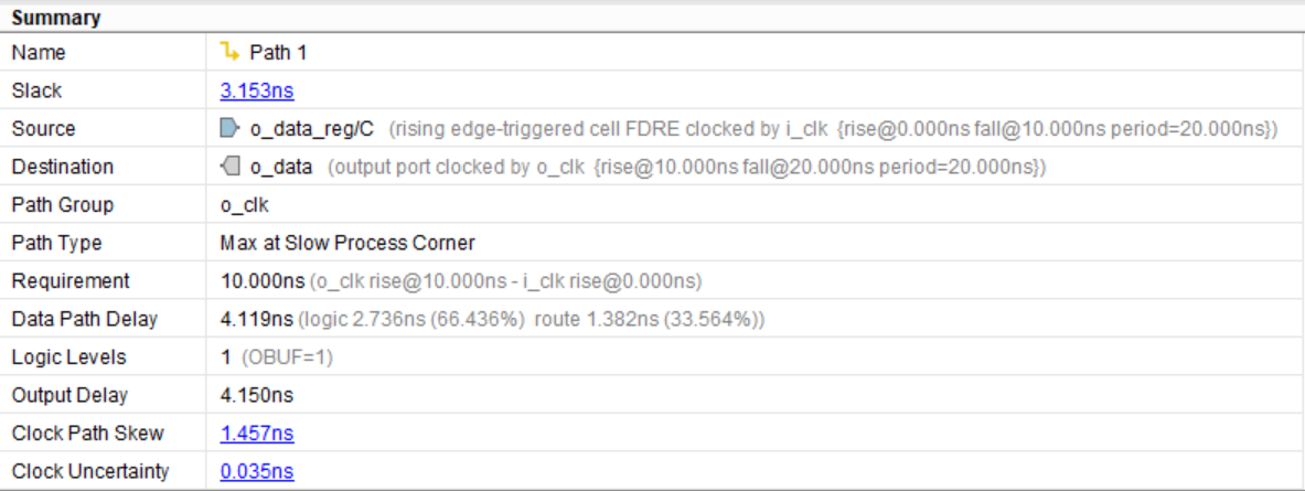 На рисунке 6 представлен раздел Summary временного отчета. Из строки с именем Source можно увидеть, что путь внутри FPGA начинается на входе триггера o_data_reg, при этом запускающим является тактовый сигнал i_clk. Строка Destination указывает, что данные выдаются через выходную ножку o_data и защелкиваются по сигналу o_clk. Положительное значение Slack, равное 10.763 нс, означает, что временные ограничения выполнены.