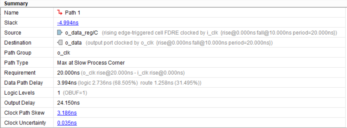 Если сравнить значение output delay, равное -24.15 нс, со значением на рисунке 9, то увидим, что они различаются как раз на 20 нс. За счет этой разницы компенсируется задержка появления фронта i_clk в первой строке рисунка 12. С учетом неопределённости и пессимизма тактового сигнала получаем, что данные должны достигнуть ножки o_data FPGA в момент времени 3.392 нс. Фактическое же время прибытия данных равно 8.386 нс. Это на 4.994 нс позже, чем требуется, а значит данные распространяются слишком медленно.