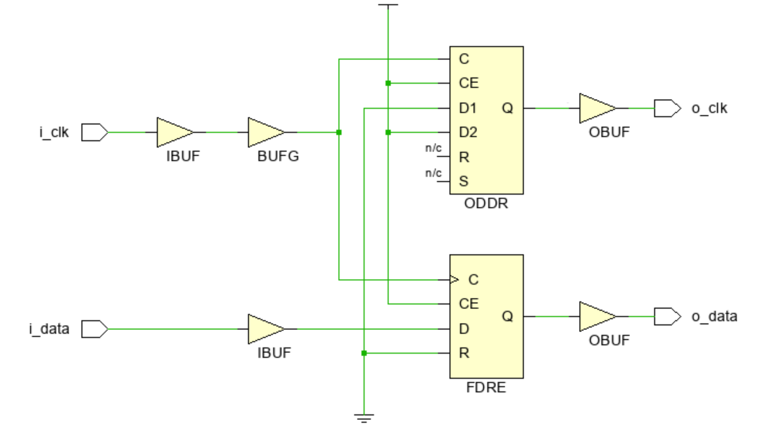 Отметим ряд моментов, на которые следует обратить внимание. На тактовый вход C ODDR поступает сигнал i_clk. В качестве источника для ножки o_clk FPGA теперь выступает сигнал с выхода Q ODDR. По каждому фронту на входе C ODDR сигнал со его входа D1 передается на выход Q. В свою очередь значение на входе D2 попадает на выход Q по каждому спаду тактового сигнала.
