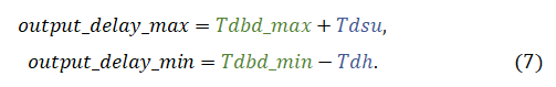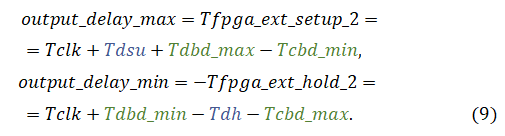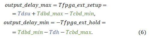 С помощью флагов -max и -min задаются минимальная (Tcbd_min) и максимальная (Tcbd_max) задержки распространения тактового сигнала от выхода FPGA до микросхемы LAN8740A. Так как эти задержки указываются отдельно, их нужно убрать из уравнений (6), которые теперь примут вид: