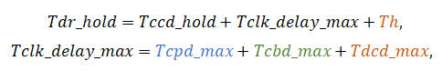 Рассмотрим второй вариант, при котором данные запускаются и защелкиваются одним и тем же тактовым фронтом. В этом случае защёлкивающий и запускающий фронты появляются одновременно, поэтому значение Tccd_setup равно нулю. В свою очередь предыдущий защелкивающий фронт появляется на один период раньше текущего запускающего фронта, а значит задержка между ними равна Tccd_hold = –Tclk. С учетом всего вышесказанного уравнения (3) и (4) примут вид: