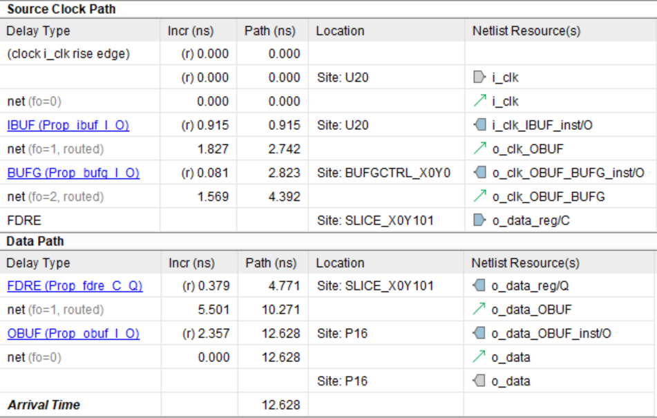 На рисунке 7 показаны задержки распространения для запускающего фронта и данных. Можно увидеть, что фронт сигнала i_clk появляется в нулевой момент времени и проходит через входной и тактовый буферы. Через 4.392 нс он достигает тактовой ножки триггера и запускает передачу данных. В свою очередь данные распространяются через выходной буфер и попадают на выход o_data в момент времени 12.628 нс.