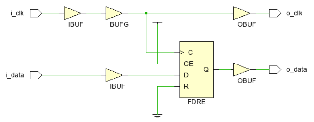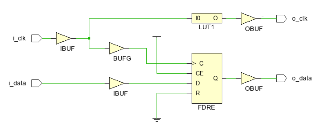 По коду и на схеме можно увидеть, что на вход D1 ODDR постоянно подается нулевой сигнал, а на вход D2 – единичный. Таким образом, по фронту сигнала i_clk значение выхода Q ODDR изменяется с единицы в ноль, и появляется спад. По каждому спаду i_clk прошлое нулевое значение на выходе Q изменяется на единичное, и формируется фронт. В результате на выходе Q ODDR получается инвертированная копия сигнала i_clk.