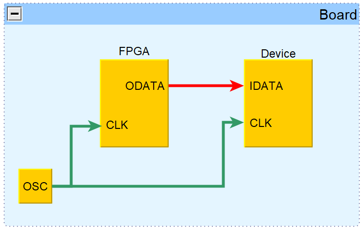 В текущей статье будет рассмотрен другой способ, называемый Source Synchronous, при котором источник помимо данных также формирует тактовый сигнал (см. рисунок 2). В дальнейшем для краткости устройство, в которое из FPGA передаются данные и тактовый сигнал, будем иногда называть Device.