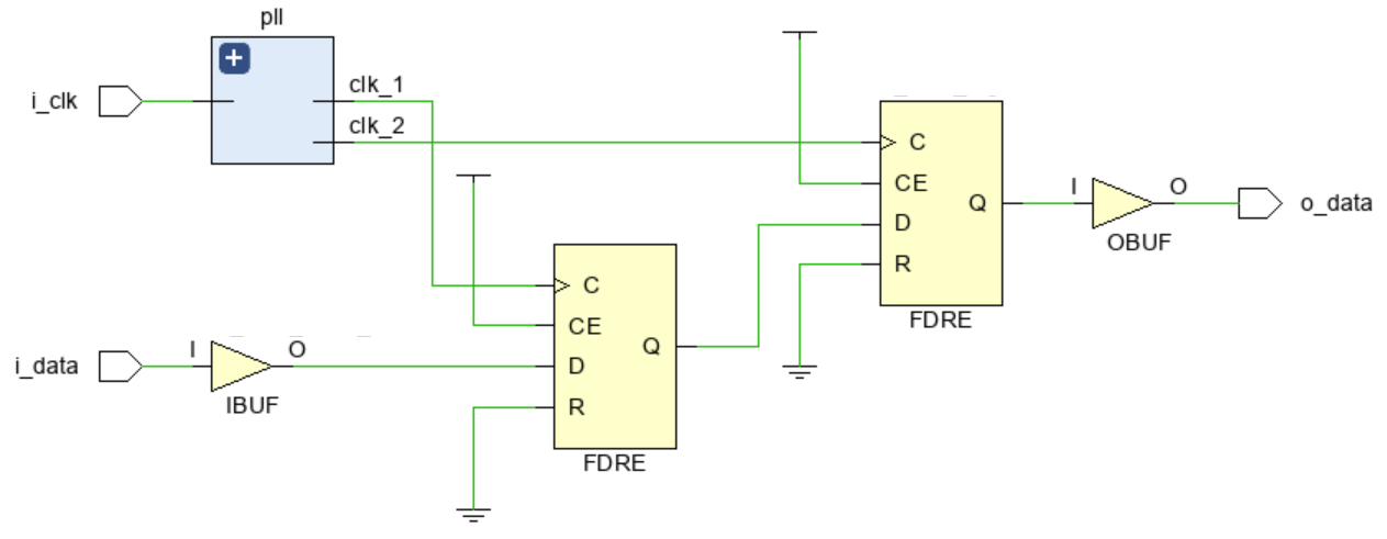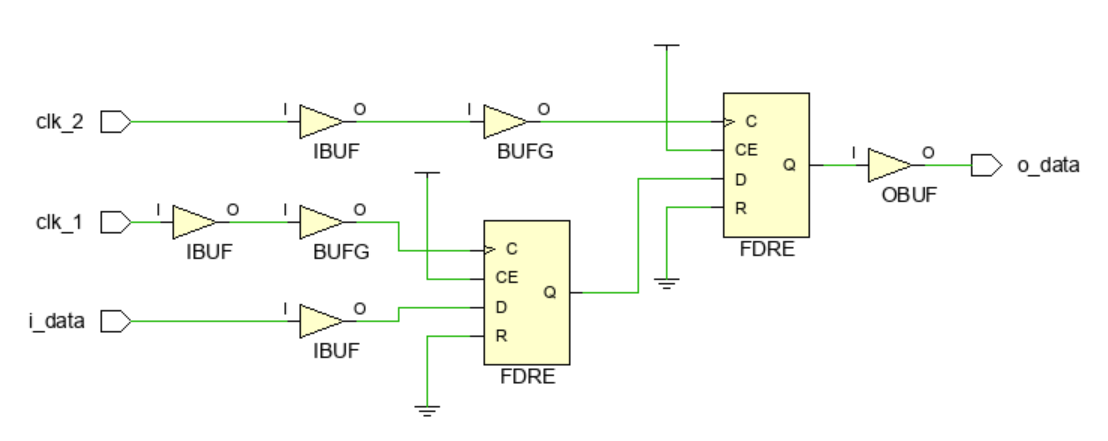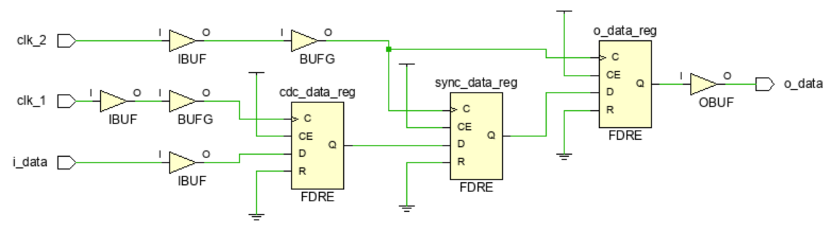 Кратко разберем принцип работы синхронизатора. Так как домены clk_1 и clk_2 являются асинхронными, временные соотношения между их тактовыми сигналами неизвестны. Это означает, что при передаче данных для триггера sync_data_reg могут возникать нарушения времени установки и удержания, и он будет попадать в метастабильное состояние. В случае метастабильности сигнал на выходе sync_data_reg примет некоторый неопределенный уровень между нулем и единицей. Этот сигнал будет распространяться дальше по схеме и в итоге попадет на вход триггера o_data_reg.