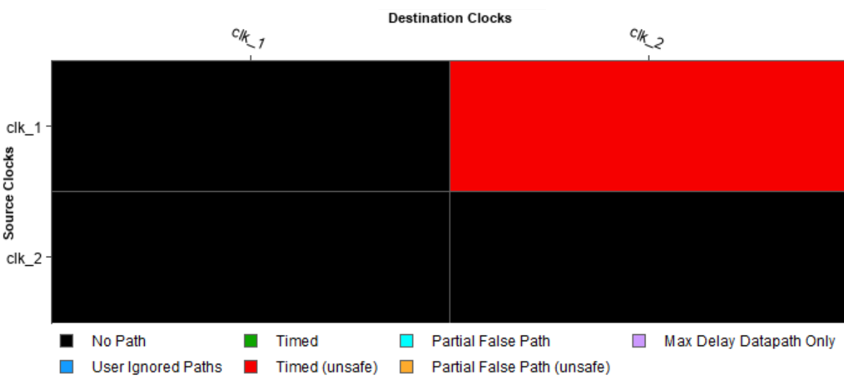 Для нашего примера отчет Clock Interaction будет иметь вид, представленный на рисунке 5. В проекте есть всего одни путь из домена clk_1 в домен clk_2. Тактовые сигналы формируются вне FPGA, поэтому Vivado считает их асинхронными. Это означает, что правильно провести временной анализ невозможно. В таблице клетка на пересечении clk_1 и clk_2 обозначена красным цветом.