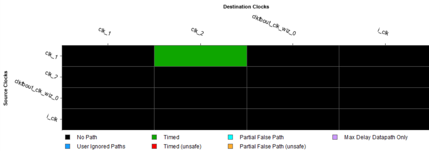 Проверить корректность проведения временного анализа при пересечении тактовых доменом можно с помощью отчета, который называется Clock Interaction. Он представляет из себя таблицу, где по горизонтали отложены передающие тактовые сигналы, а по вертикали – принимающие. С помощью цвета указывается информация о временном анализе.