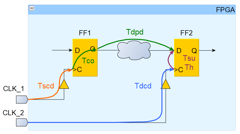 Рассмотрим, как выполняется временной анализ при пересечении тактовых доменов. На рисунке 1 показан путь, на который нанесены задержки для данных и тактовых сигналов. Передающий триггер FF1 тактируется сигналом CLK_1, а приёмный триггер FF2 – сигналом CLK_2.