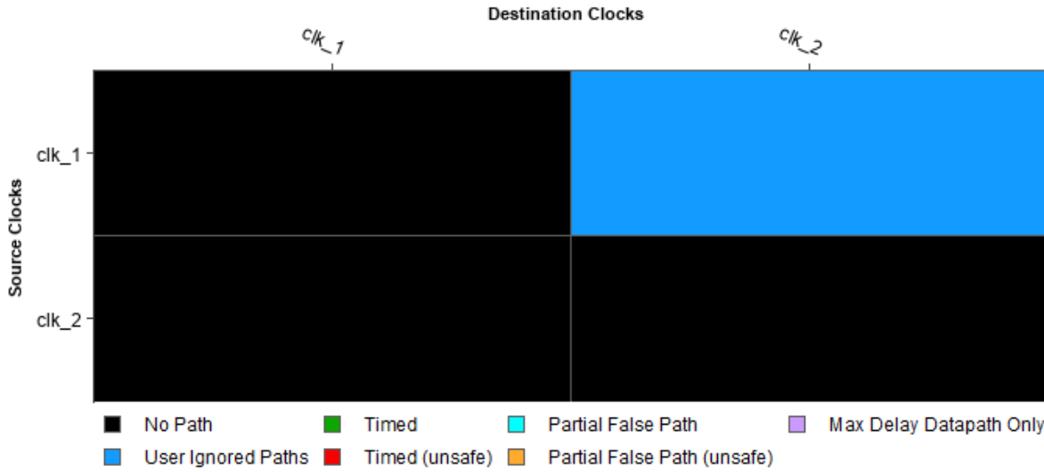Теперь изучим, как это отразилось на отчете Clock Interaction (см. рисунок 12). Ячейка таблицы, соответствующая пути из домена clk_1 в домен clk_2, помечена синим цветом. Это означает, что разработчик проекта вручную исключил пути из временного анализа (User Ignored Paths).