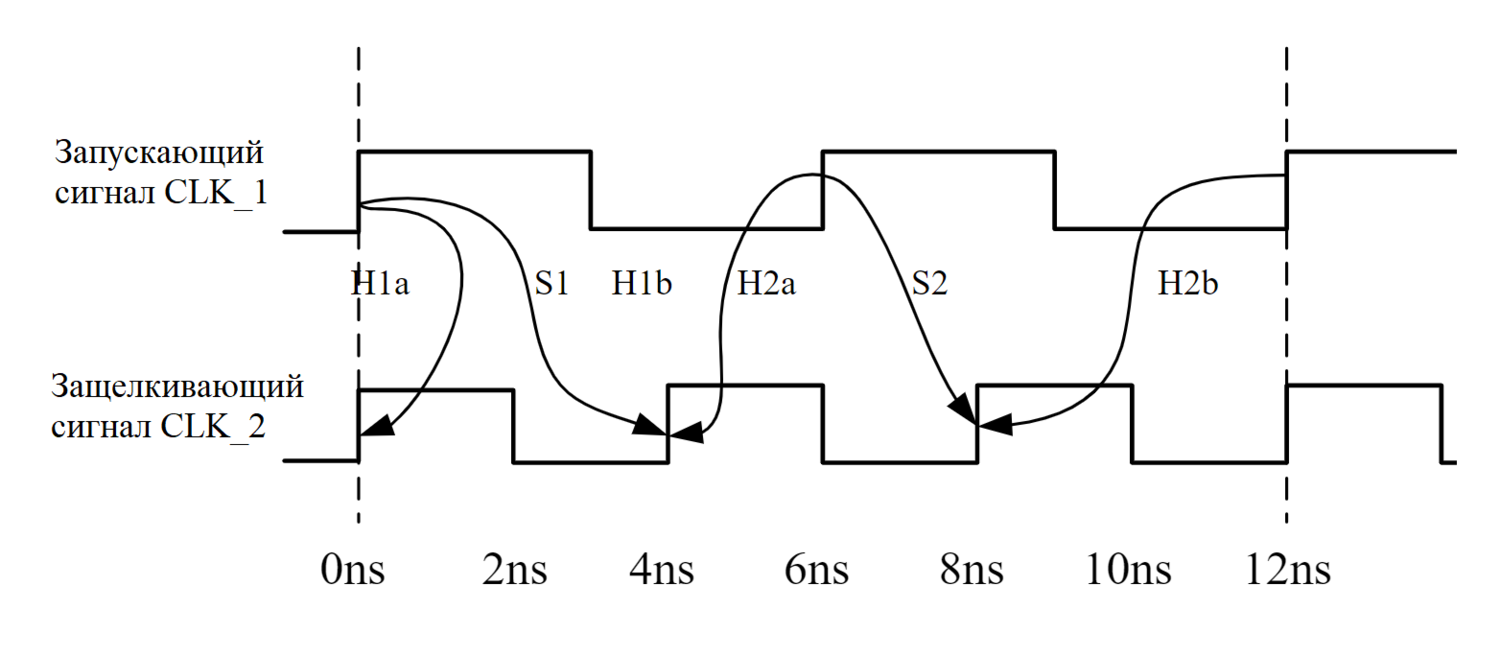 b) данные, которые передаются фронтом CLK_1, следующим после запускающего, не должны быть приняты текущим защелкивающим фронтом CLK_2.