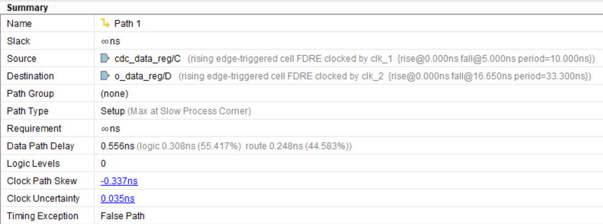 Можно увидеть, что для пути между доменами временной анализ проводится (Timed), но его результатам не следует доверять (unsafe). Причиной является асинхронность тактовых сигналов, так как они формируются из разных источников (No Common Clock).