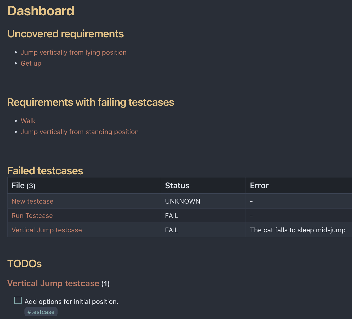 Чтобы получить список требований с падающими тестами, нужно обратиться к полю Status на странице теста. Напомню, что это поле содержится в YAML frontmatter, и именно к через это поле мы доберёмся до статуса.