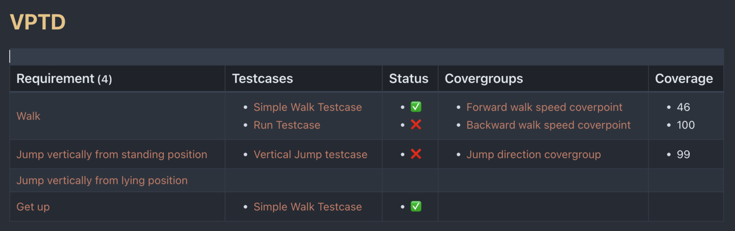 Всё красным шрифтов это ссылка на другую страницу. Таблица формируется автоматически, а связь между требованиями, тестами и группами указывается на странице описания требования. Страницы тестов и групп содержат информацию о своём состоянии.