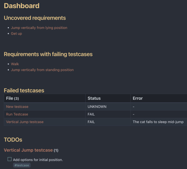В первом списке отображаются требования без связанного теста или группы. Второй список показывает требования, у которых тесты есть, но не все из них проходят. Таблица приводит все падающие тесты и их ошибки. Последний список собирает все todo из всех тестов.