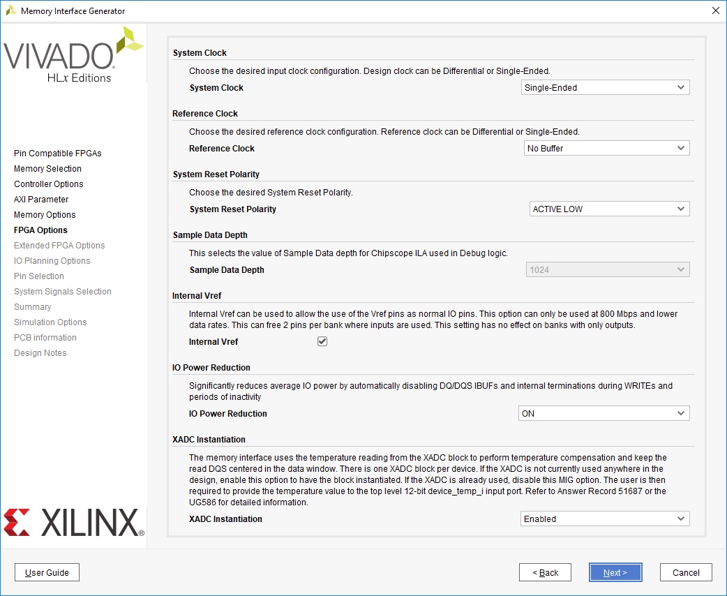 Burst Type and Length настраивает тип пакетных передач. Для DDR3 и DDR2 длина может быть только 8. Output Driver Impedance Control и ODT выставим в соответствии с настройками Digilent’a. При настройке другой платы выходной импеданс нужно искать в документации. Остальные настройки оставим по умолчанию и перейдем на вкладку FPGA Options (рисунок 12).