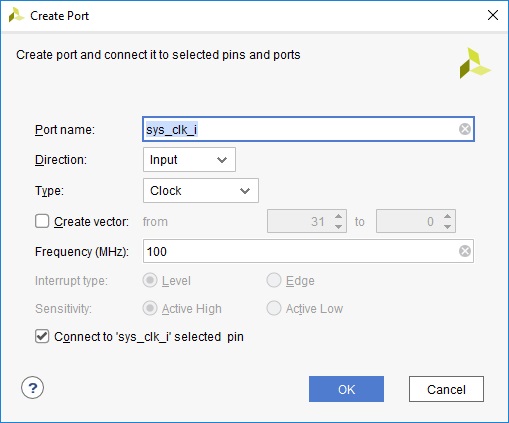 Оставляем все по умолчанию и нажимаем Ok. Если просто выбрать опцию Make External, Vivado создаст внешний порт с именем, отличным от того, которое было создано в файле констрейнов, и на этапе синтеза и имплементации появится критическое предупреждение, указывающее на отсутствие в дизайне порта с именем sys_clk_i.