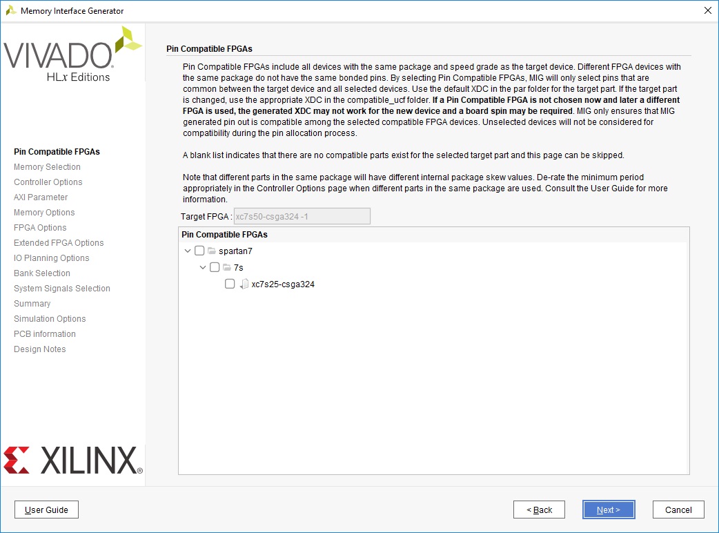 На текущей вкладке мы можем выбрать дополнительные FPGA, совместимые с нашей по корпусу и температуре. При выборе дополнительно совместимых FPGA, MIG будет резервировать только те выводы, которые являются общими для всех выбранных микросхем. Так как сейчас нам это не нужно, мы можем продолжить и перейти к вкладке Memory Selections (рисунок 7).