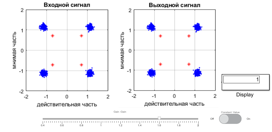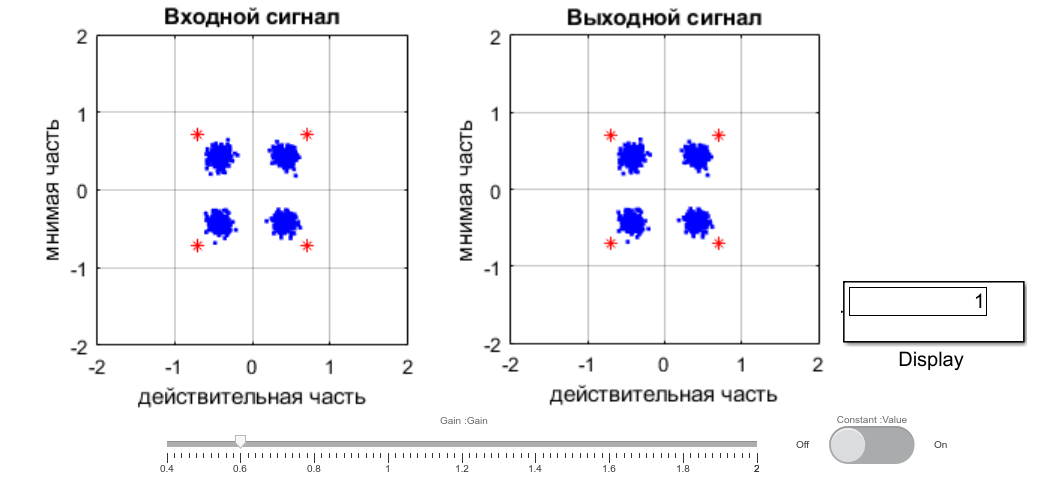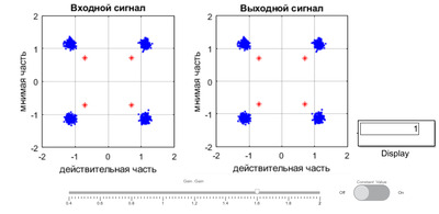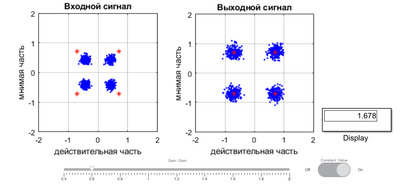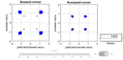 Ниже представлены результаты моделирования АРУ при различных уровнях сигнала на входе. На рисунке 10 представлены созвездия сигналов на входе и выходе, элементы интерактивного управления и блок, отображающий коэффициент усиления АРУ. При прохождении через канал связи сигнал умножается на 0.6, что соответствует ослаблению на 4.4 дБ. Система АРУ выключена, поэтому ее коэффициент равен единице. Красными отметками обозначены точки, соответствующие таблице 1.