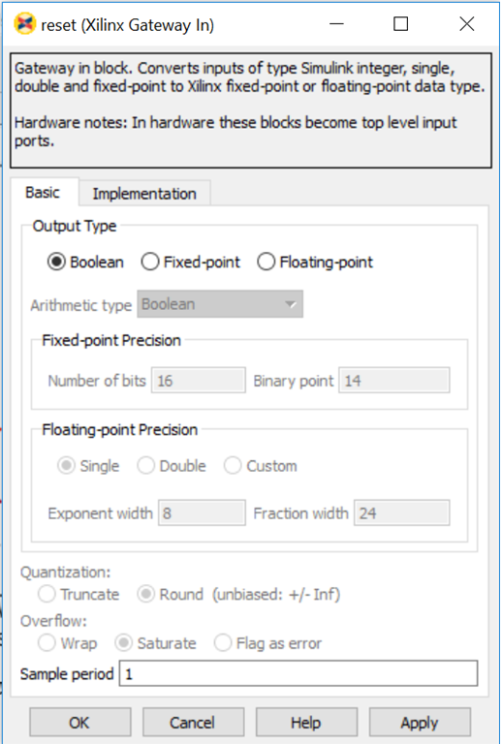 На этом этапе в модель внесены все Simulink блоки. Для передачи данных между блоками Simulink и блоками System Generator необходимо добавить блоки Gateway In и Gateway Out. Настройки блоков Gateway In, управляющих портами АРУ reset и enable, представлены на рисунке 7-а). Настройки блоков для управления портами data_in_i и data_in_q показаны на рисунке 7-б). Основные параметры – это формат входного сигнала, квантование, обработка переполнения и шаг дискретизации.