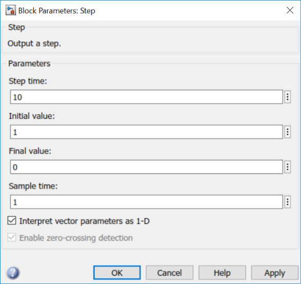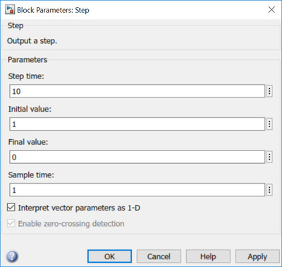 - · Step – формирует активный уровень сигнала сброса в начале моделирования;
