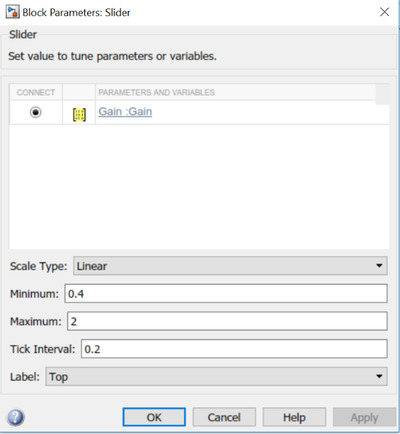 - · Slider – привязывается к блоку Gain и позволяет интерактивно задавать ослабление сигнала в канале;