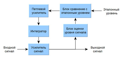 Входной сигнал проходит через усилитель, коэффициент усиления которого может регулироваться. Уровень сигнала после усиления подвергается оценке. Для цифровых сигналов в качестве оценки уровня обычно выступает амплитуда принятого символа, вычисляемая по формуле